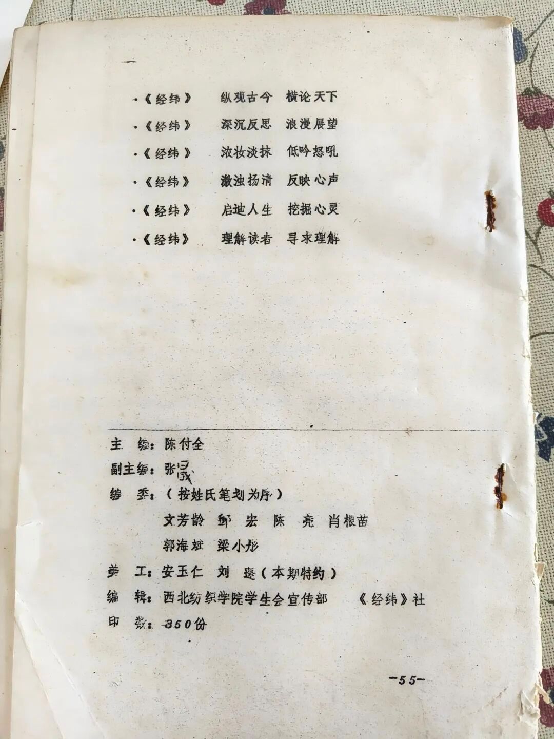 记得入校第二年,校学生会改选,我当选为宣传部部长。我和当时的副部长、来自新疆的毛纺84级张同学等一起创办了校内刊物《经纬》。当时我只是想,咱们学校以纺织服装为特色,布料有经纬,思想也该有经纬。那就是它的广度、深度和温度。于是,便将刊物起名叫《经纬》。