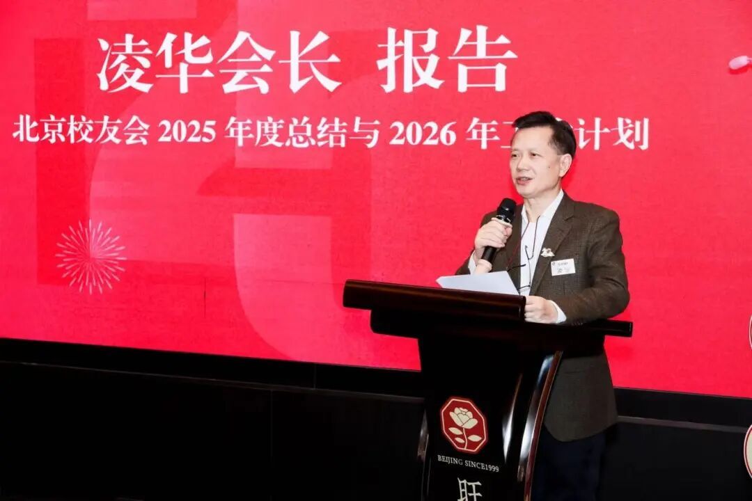 北京校友会会长凌华在发言中,全面回顾了校友会过去一年在组织建设、校友服务、校地联动等方面的工作历程与丰硕成果。他呼吁广大在京校友继续以校友会为情感纽带与合作平台,进一步强化母校与校友、校友与校友之间的紧密联结,汇聚各方磅礴力量,筑牢母校与社会沟通的坚实桥梁,以实际行动回馈母校的深情厚意与殷切期望。